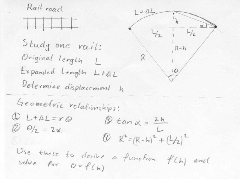 A particular problem is de-railing due to curving of the tracks. This problem is sometimes also called sun curves, since it is caused by the sun heating the rails. When the rails heat up they expand slightly. When the endpoints are fixed instead of expansion along the track the rail will curve out in a circle segment. Perhaps surprisingly even a small expansion can cause a significant lateral displacement. A particular rail has a base length L=20m. During the day it has expanded with 2mm = 0.002m. Determine the lateral displacement h caused by this. Use Newton's method to solve the problem. How can you find a good starting approximation for h?