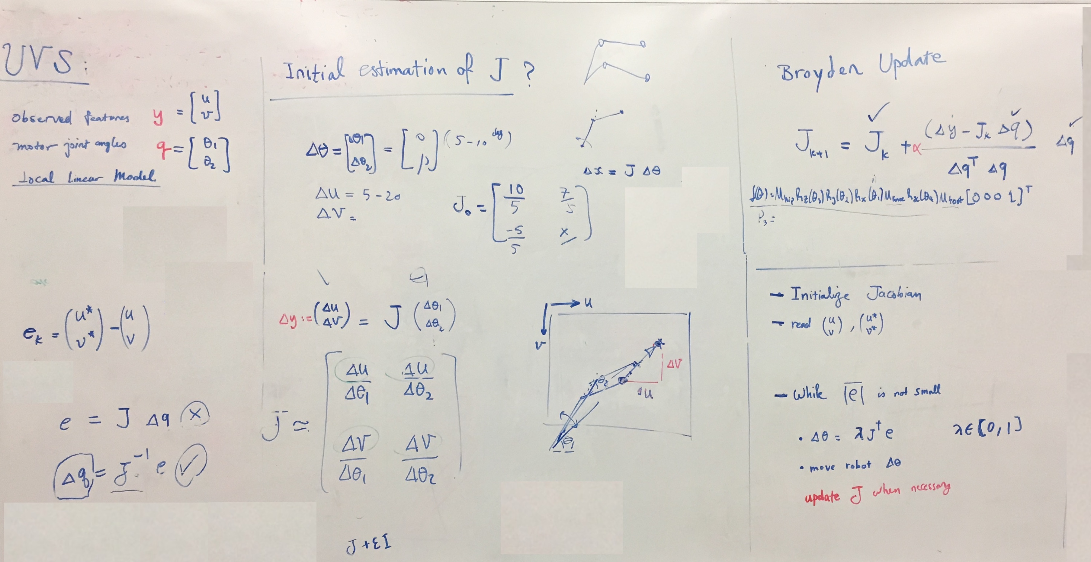 Implement Uncalibrated Visual Servoing (UVS) to move your 2-DOF planar robot arm to a desired position. Your program should be able to dynamically track the end-effector of your robot and a moving target. Tip: OpenCV has tracking modules you can use.